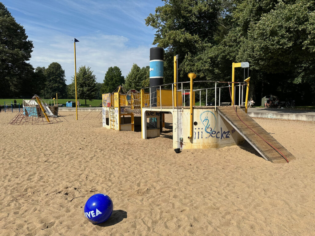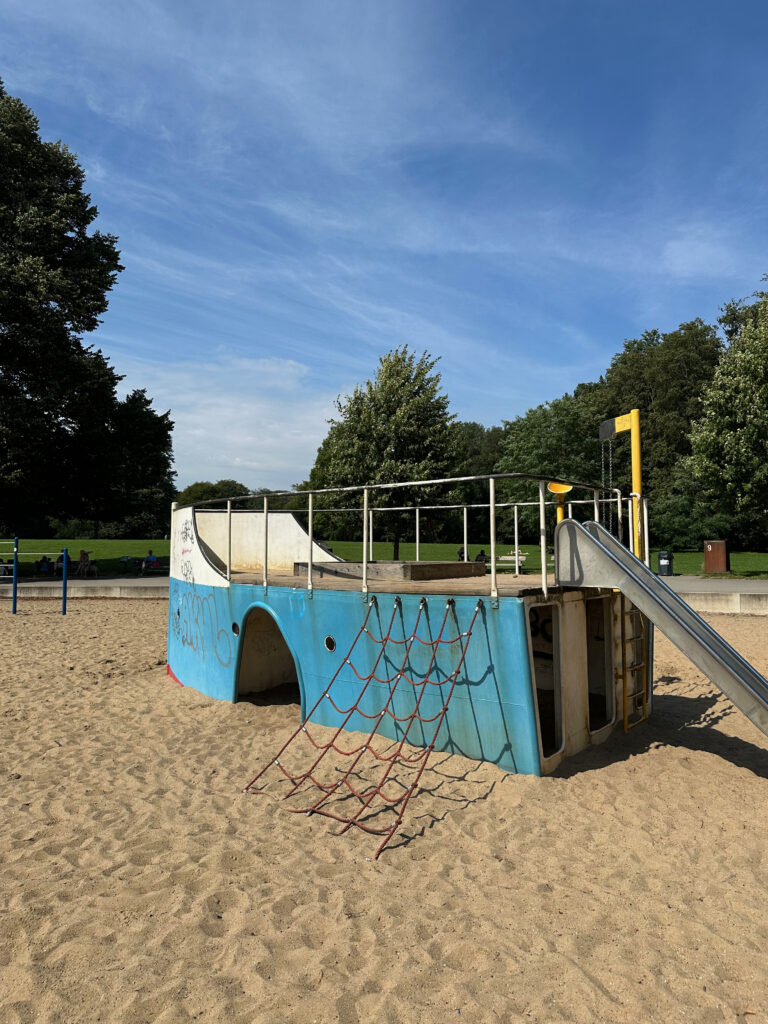 Der große Hamburg Spielplatz beim Planschbecken und der großen Wiese hat einiges zu bieten: Platz zum Toben, Sandburgen bauen und planschen, aber auch zum Grillen. Für uns einer der besten Spielplätze in Hamburg.