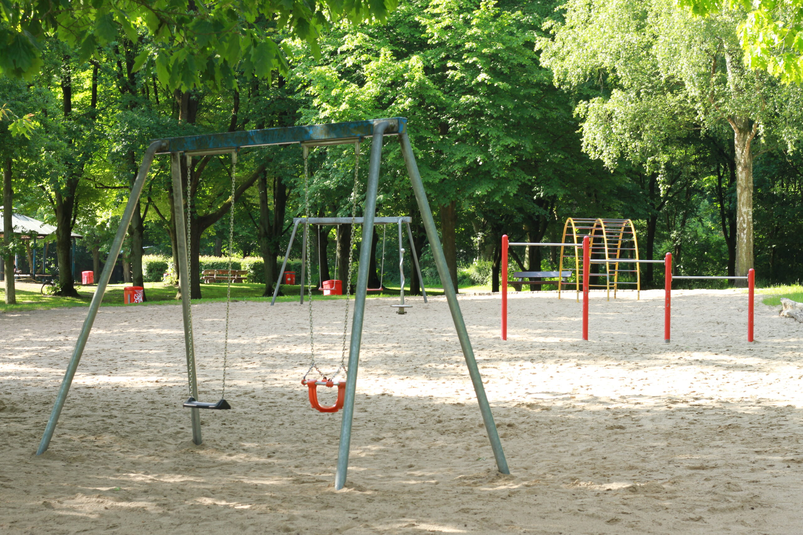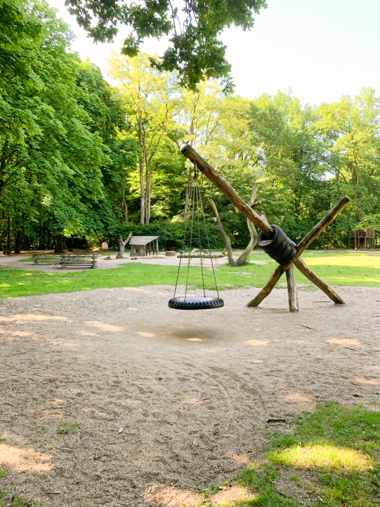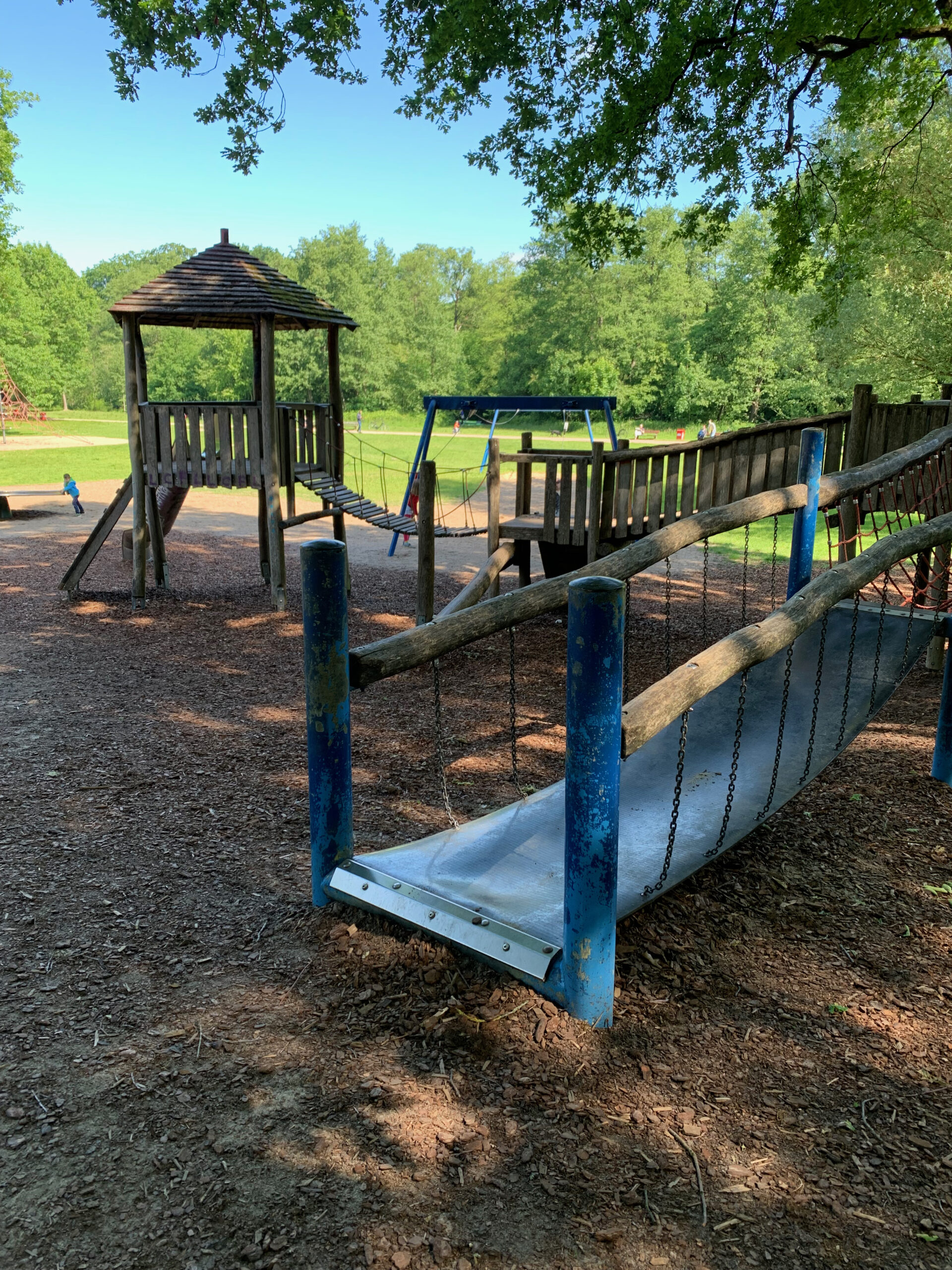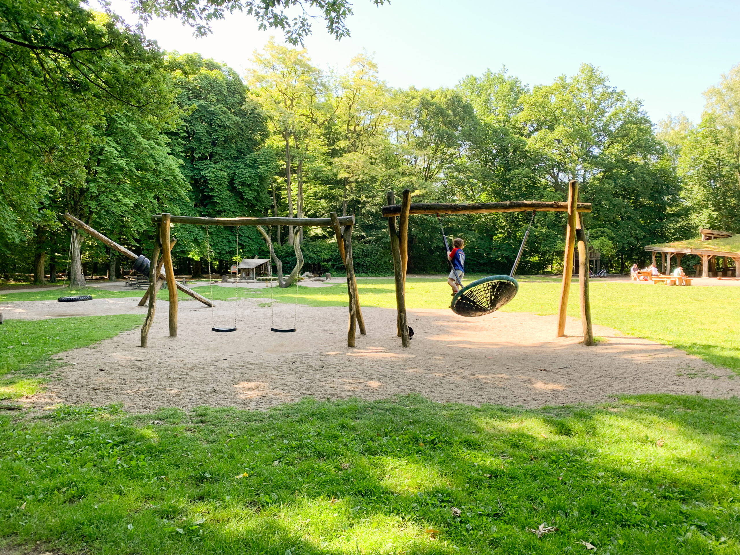 Es gibt außerdem viele tolle andere Spielgeräte wie eine Bergrutsche, Schaukeln, eine Nestschaukel, eine Seilbahn sowie ein Kletterwäldchen. Eltern können sich auf den schattigen Bänken entspannen und die Natur genießen. Wer Lust auf Erfrischung hat, kann sich beim Eiswagen ein leckeres Eis holen.