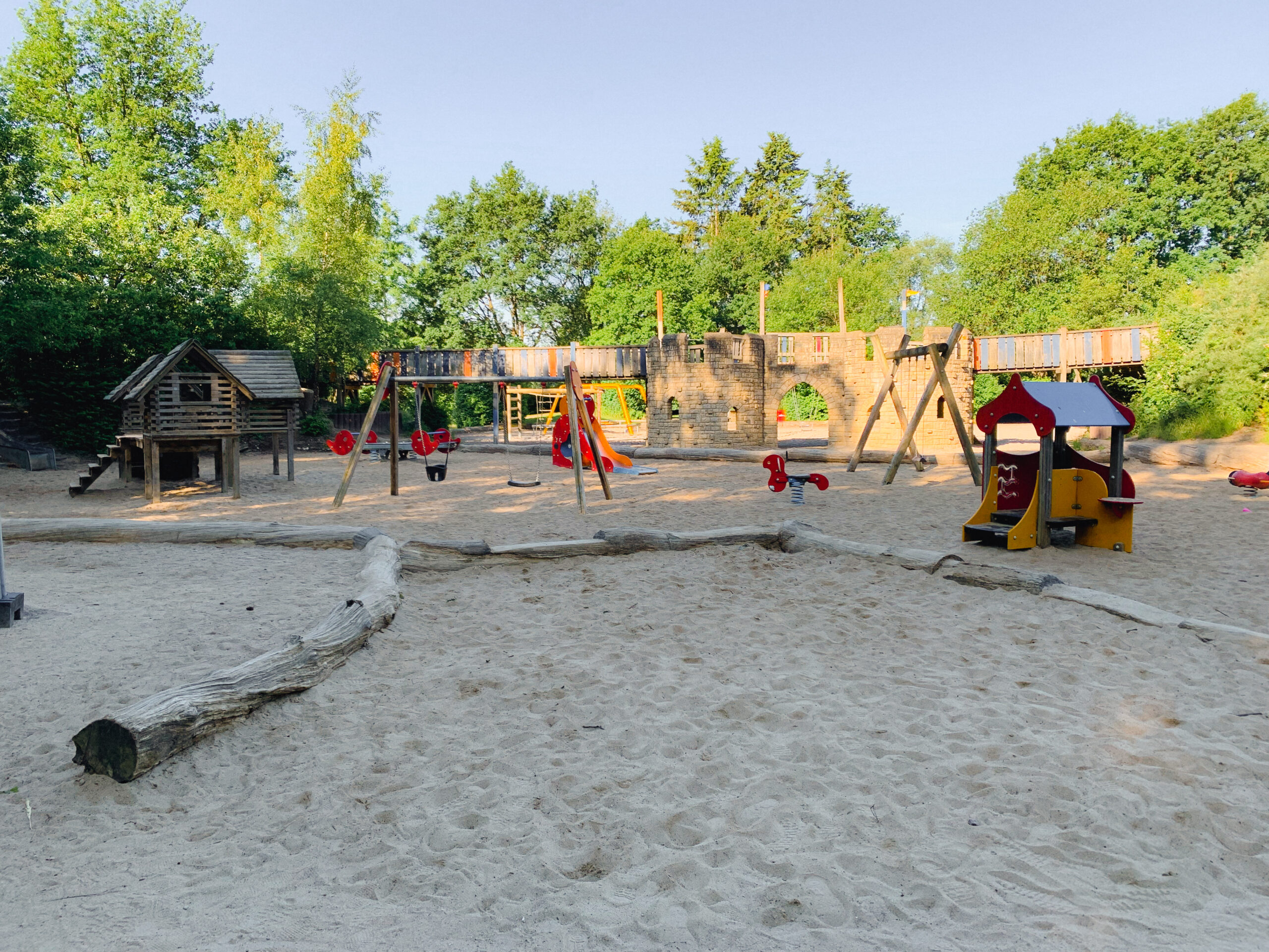 Der Blickfang ist die große Ritterburg mit zwei Holzbrücken, die verschiedene Klettermöglichkeiten in unterschiedlichen Schwierigkeitsgraden bietet. Auf den Sandspielflächen gibt es Schaukeln, eine Riesenrutsche, Spielhäuschen, Wipptiere und Klettergerüste sowie ein kleines Trampolin.