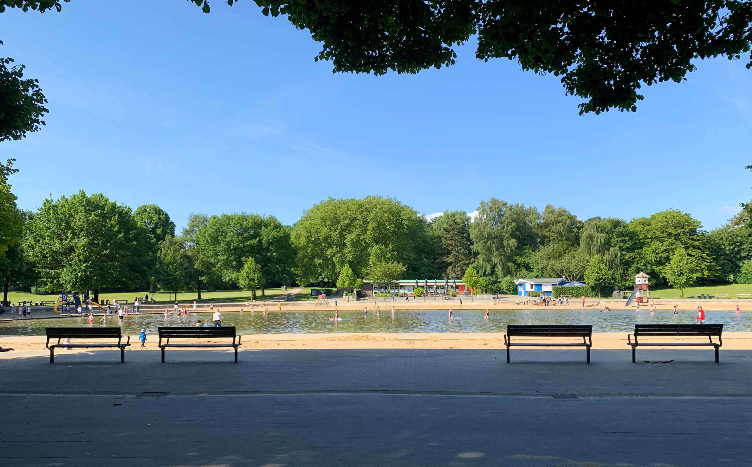 Highlight und Mittelpunkt des Spielplatzes ist das große Planschbecken, das von einem 10 Meter breiten feinen Sandstrand umgeben ist und im Rahmen des 100. Stadtpark-Jubiläum komplett saniert wurde.