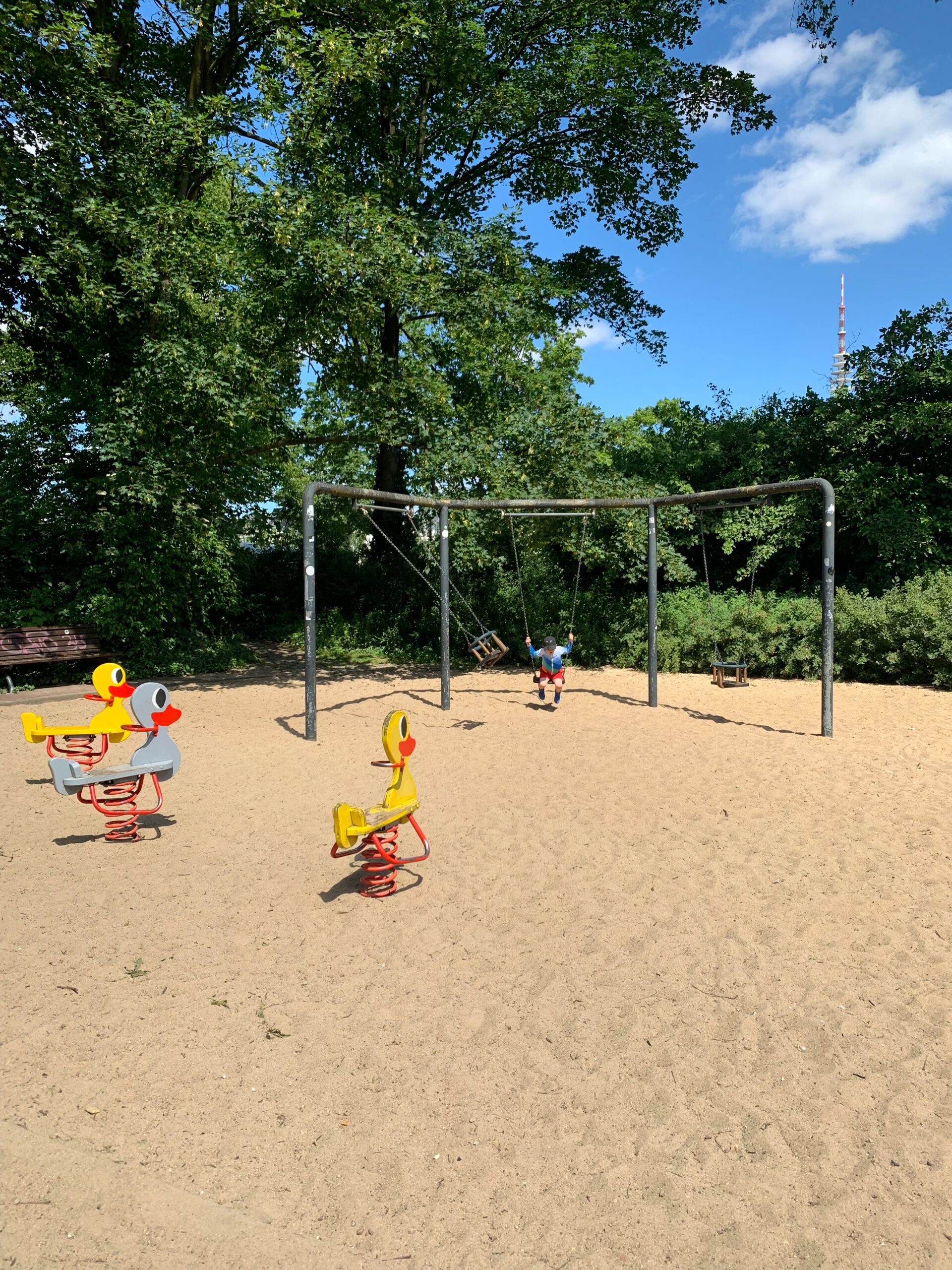 Wir lieben es, mehrere Stunden auf dem Spielplatz zu verbringen, bei strahlend schönem Wetter, aber auch bei Nieselregen. Wir starten oft frühmorgens mit dem Fahrrad und nehmen Schaufel, Eimer, Snacks und oft auch den Grill mit. Das Schöne ist, dass du morgens viele Spielplätze in Hamburg noch fast ganz für dich hast.