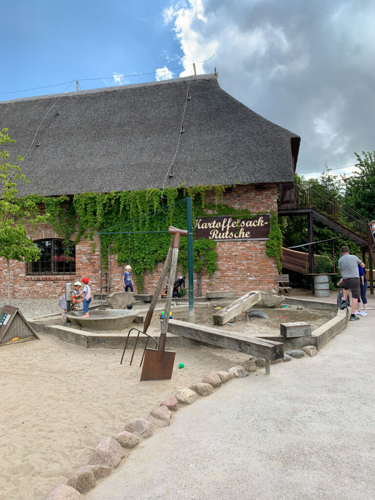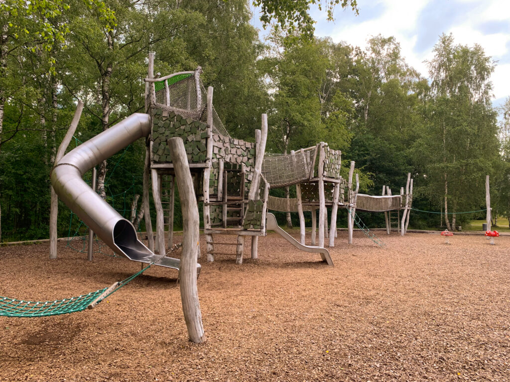 Nach der Tour durch den Park gehen wir zum Abschluss immer noch auf den großen Abenteuerspielplatz. Der Spielplatz hat viele abwechslungsreiche Spielgeräte und einen sehr schönen und bei den Kindern beliebten Wasserspielplatz. Einige Spielgeräte wie das Karussell sind kostenpflichtig.