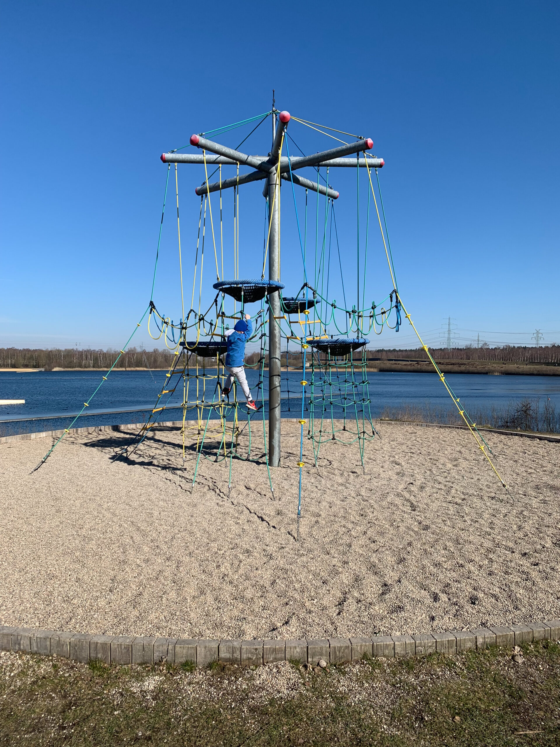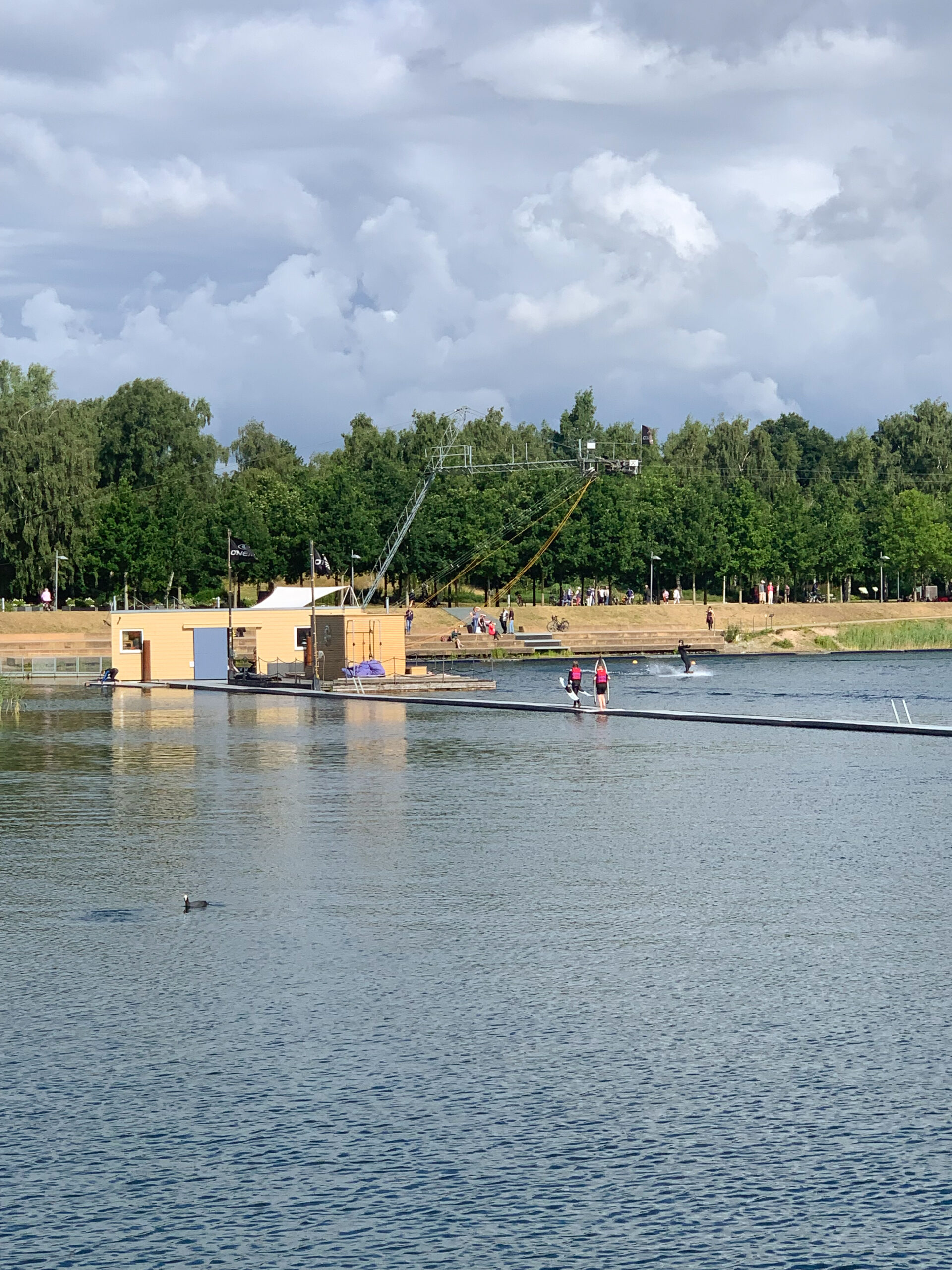 Im Stadtpark Norderstedt machen wir zu Beginn oft einen Spaziergang rechts entlang der Wasserski Anlage. Auf der kleinen Seebrücke könnt ihr verschiedene Wasservögel beobachten oder den Wakeboardern zuschauen. Hinter der Brücke gibt es ein großes Kletternest und Bänke zum Entspannen.