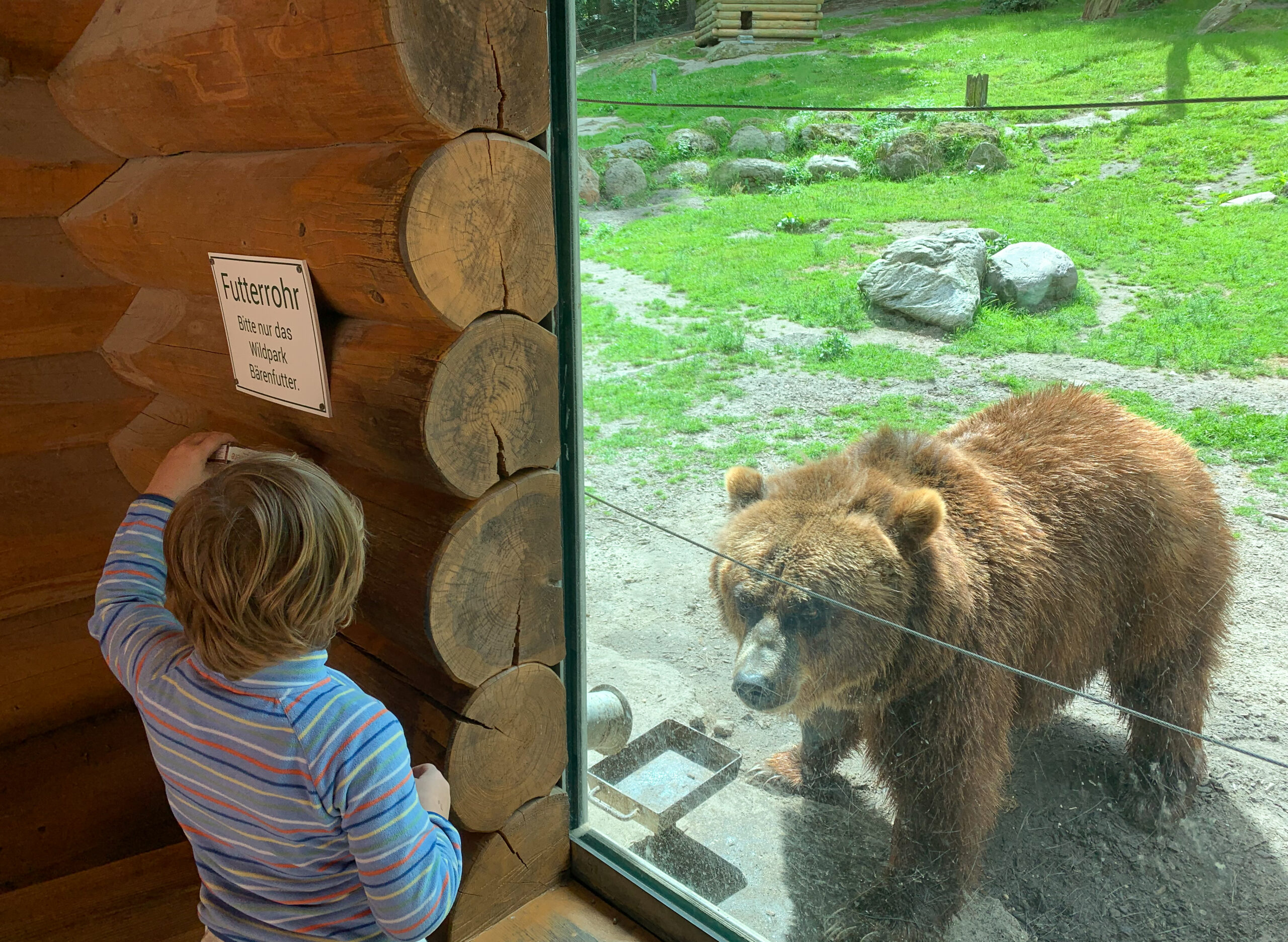 Ein Highlight ist die Möglichkeit, die Bären über ein Futterrohr selber zu füttern. Es trennen einen nur wenige Zentimeter und natürlich eine dicke Scheibe von diesen beindruckenden Tieren.