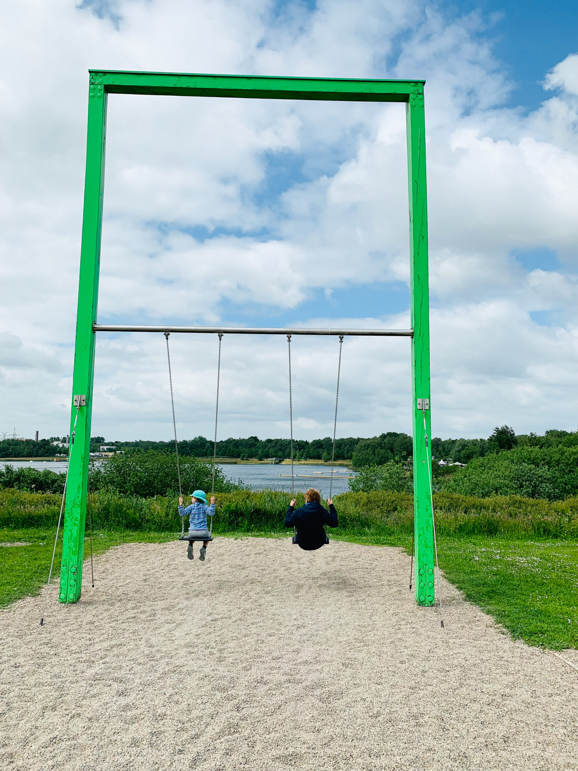 Geht ihr den Weg weiter, kommt ihr nach wenigen Minuten zu den Riesenschaukeln mit Blick auf den Wakeboard Park, dann zu einer großen grünen Wiese und dem Strandbad.