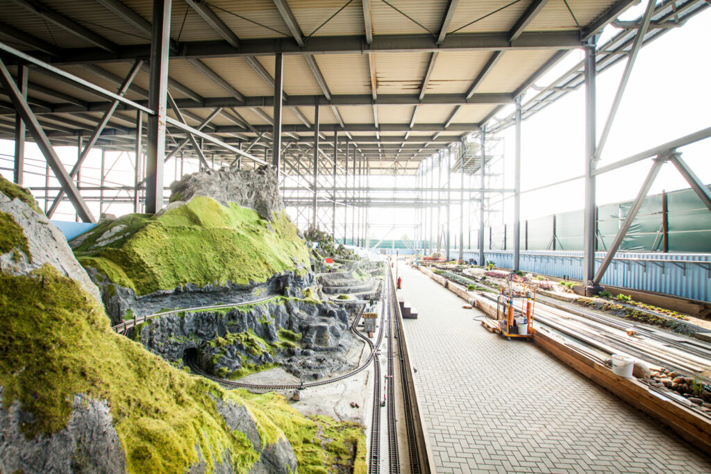 Auf 12.000 qm Fläche entstand hier eine sehr schöne und detailtreue Modelleisenbahnanlage, die überdacht ist und seitlich offen. Für Kinder ist es ein großes Vergnügen, mit einem Zug über das Gelände zu fahren.