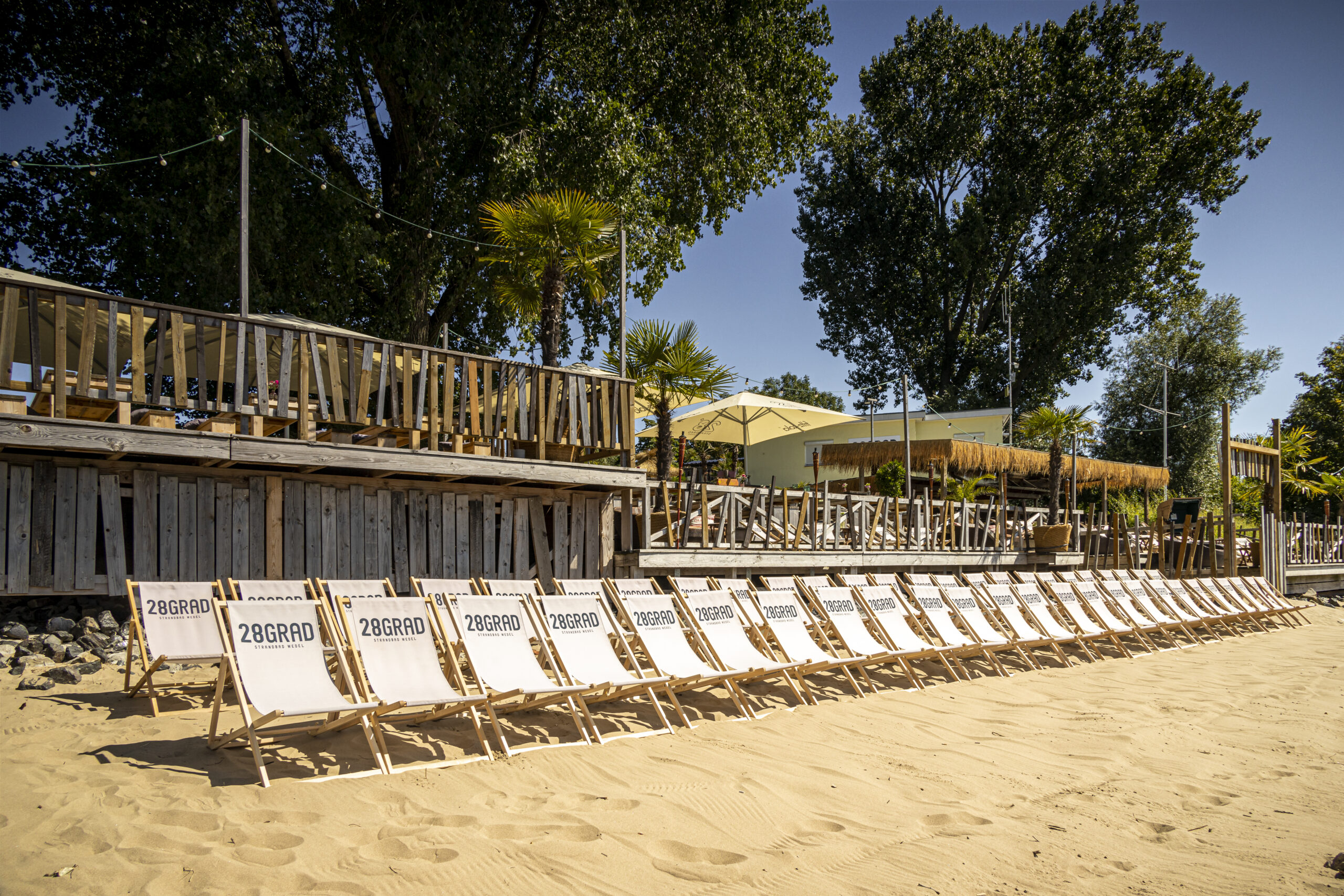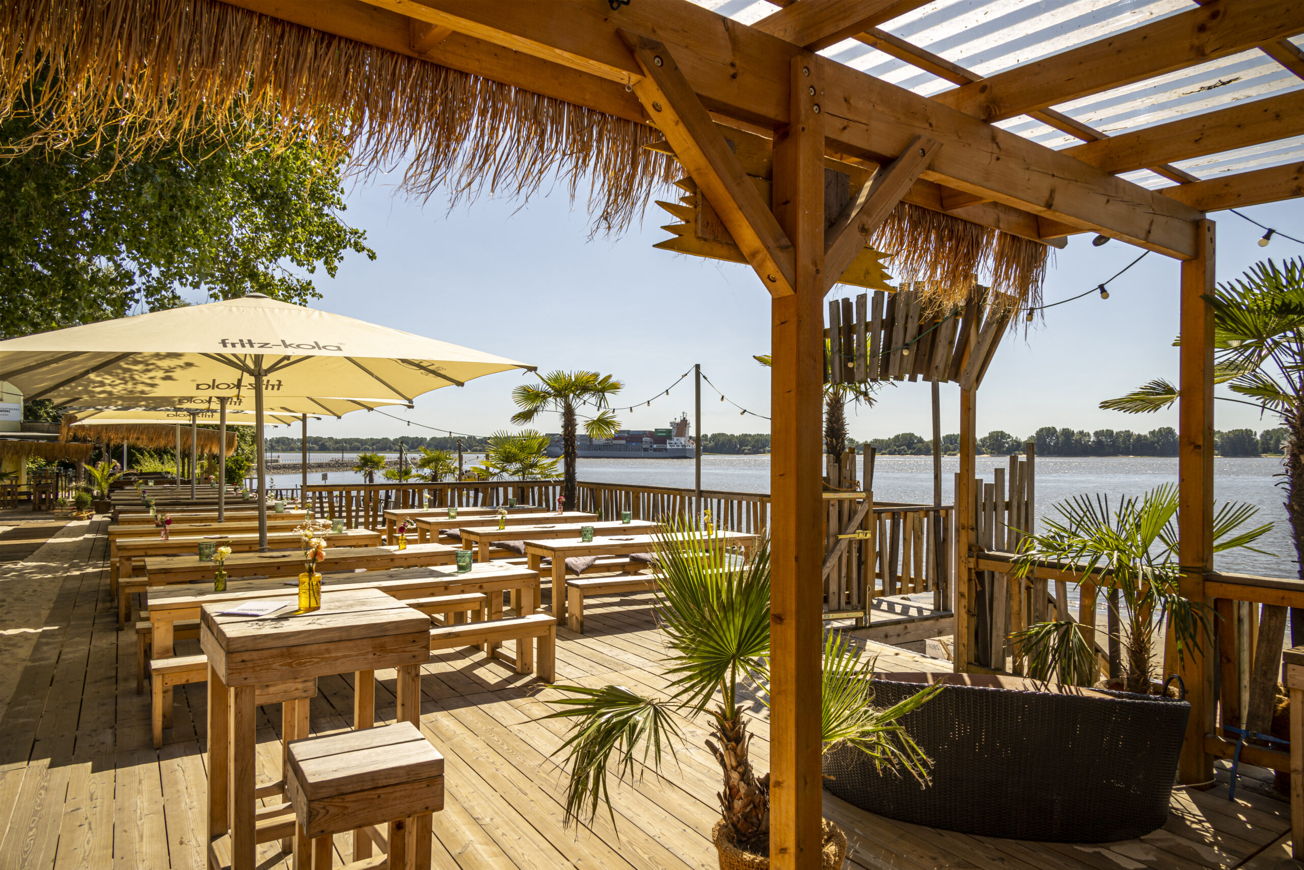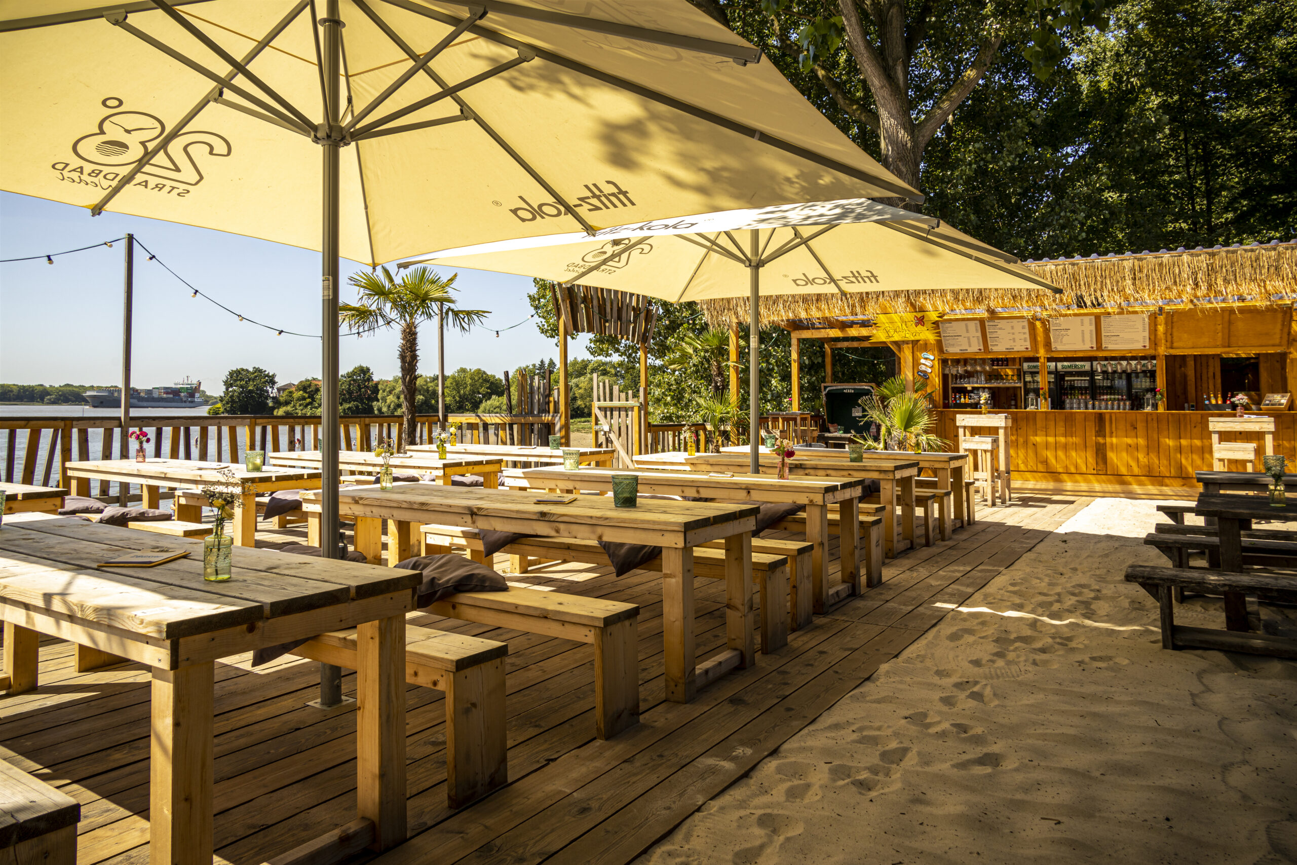 Erwachsene können in den zahlreichen Liegestühlen die chillige Atmosphäre sowie den Blick auf die zahlreichen Pötte auf der Elbe genießen. Kinder können nach Herzenslust im Sand buddeln, Burgen bauen oder bei Ebbe im Schlick spielen.