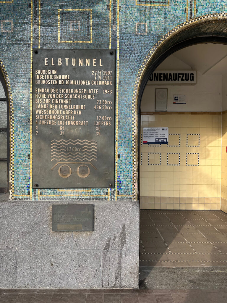 Der Alte Elbtunnel wurde 1911 eröffnet, unterquert die Norderelbe auf einer Länge von 426,5 Metern und führt circa 24 Meter unter der Erde und dem Wasser entlang. Er verbindet mit zwei gekachelten Tunnelröhren die Stadtteile St. Pauli und Steinwerder.