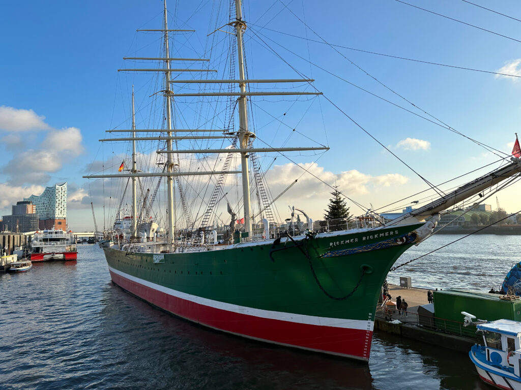 Der Hamburger Hafen bietet einige spannende Aktivitäten für Familien in Hamburg mit Kindern. Bei den St. Pauli Landungsbrücken liegt die Rickmer Rickmers, ein dreimastiges Frachtsegelschiff, das 1869 in einer Bremerhavener Werft gebaut wurde.