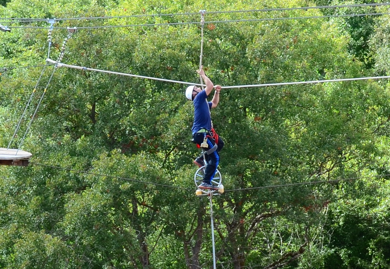 Der Klettergarten bietet Routen für jedes Level: Von der 2 Meter hohen Gelben Route für Anfänger über die 6 Meter hohe Blaue Route bis hin zur anspruchsvollen Schwarzen Route in 10 Metern Höhe. Besonders spannend sind die Ziplines und der Teufelspfad mit dem Einrad.