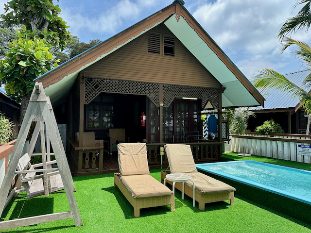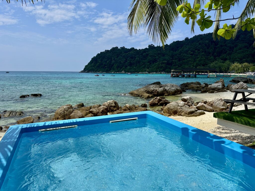 Coral View Island Resort: Ein schönes Resort direkt am Meer mit einem vorgelagerten Riff. Das Hotel hat einen kleinen Pool, einen Wasserspielplatz, ein Restaurant mit traumhafter Terrasse und Blick auf die Teluk Pauh Bucht sowie einen kleinen Kiosk für Getränke, Eis und Snacks. Es gibt viele verschiedene Zimmerkategorien. Wir würden euch nur die Zimmer in der ersten Reihe empfehlen, besonders die Suite Sea View, Family Suite View oder Premium Sea View. Wir hatten die Family Suite View mit einem privaten Pool direkt am Strand und einem schönen Blick aufs Meer.