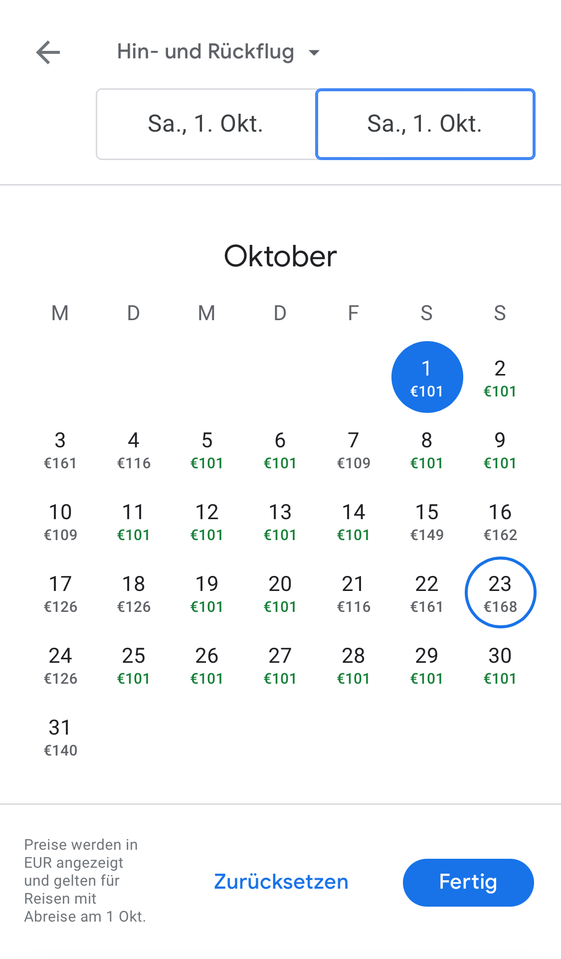 Bei Google Flights können bis zu sieben Abflug- und Zielflughäfen auf einmal ausgewählt werden. Beim Angeben der Flugdaten wird euch der Kalender angezeigt, und ihr seht automatisch die Flugpreise für jedes Datum. Anhand einer weiteren Kalenderfunktion und der Preisgrafik bekommt ihr einen sehr guten Überblick über die Preise und könnt auf einen Blick erkennen, wann die günstigsten Tage zum Reisen sind.