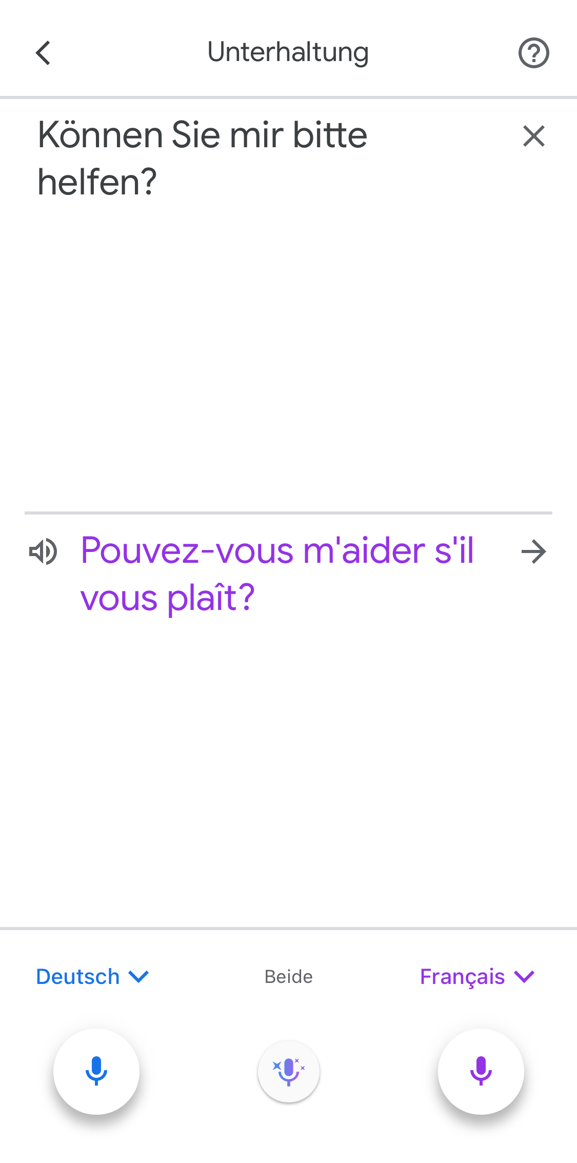 Über die App können auch Unterhaltungen geführt werden. Mikrofon aktivieren, Sprache auswählen und sprechen. Sehr hilfreich, wenn du die Sprache gar nicht sprichst, aber etwas klären möchtest mit einer Person.