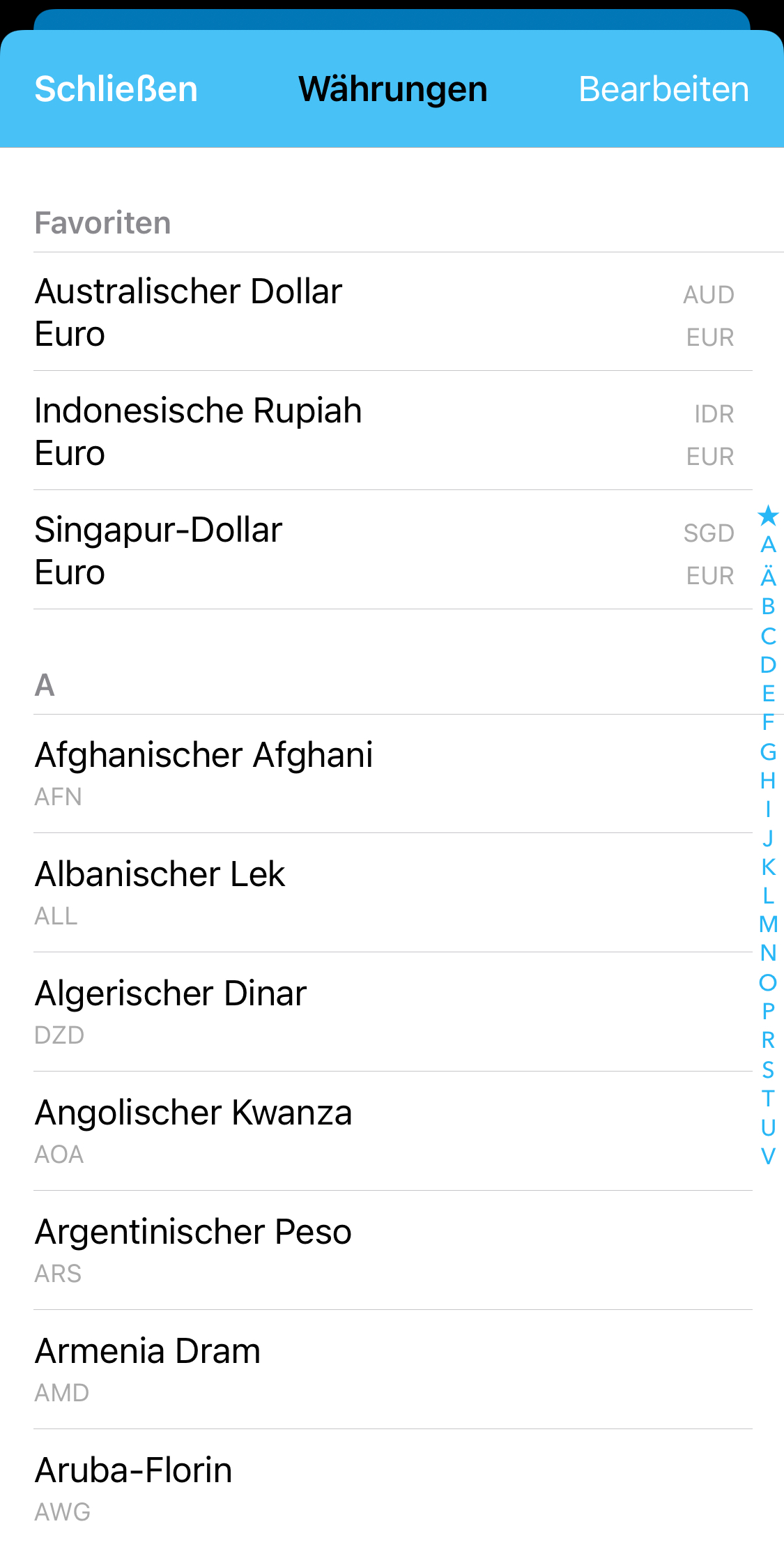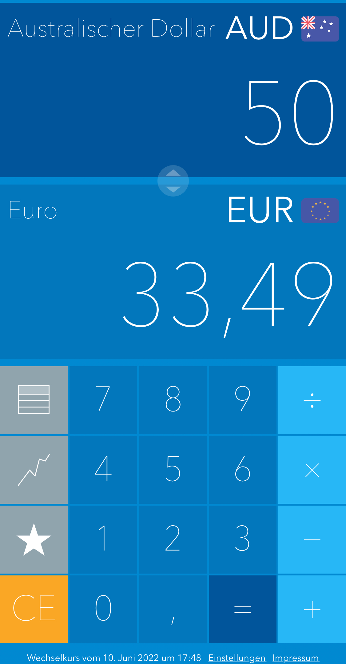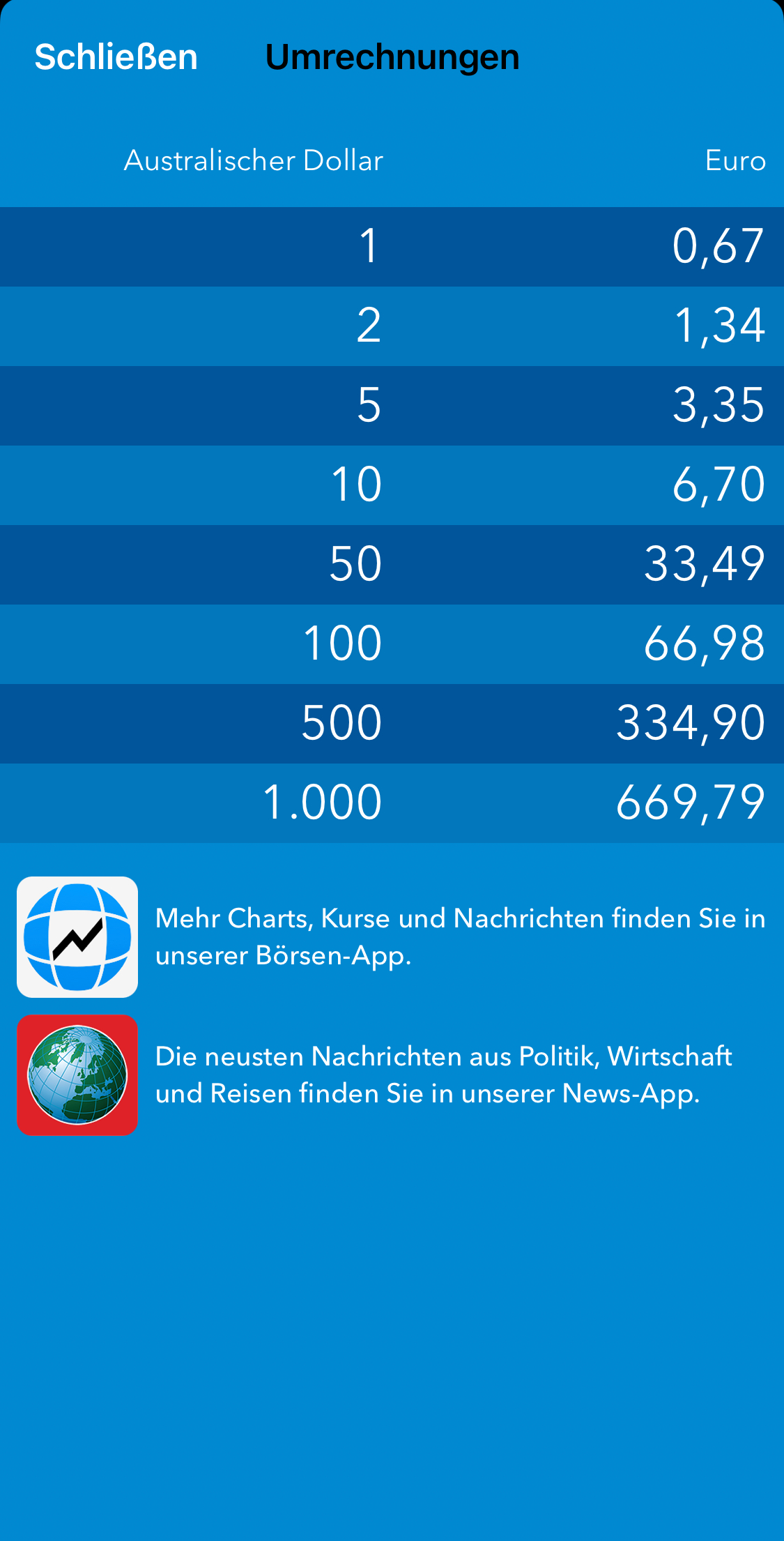 Der Währungsrechner von Finanzen 100 eignet sich sehr gut fürs Reisen und ist bei uns oft im Einsatz. Die App ist sehr übersichtlich aufgebaut. Es werden Wechselkurse zu über 150 Währungen angezeigt, und es funktioniert on- und offline. Eine Umrechnungstabelle verschafft einen guten Überblick. Praktisch ist auch die Möglichkeit, eine Favoritenliste anzulegen.