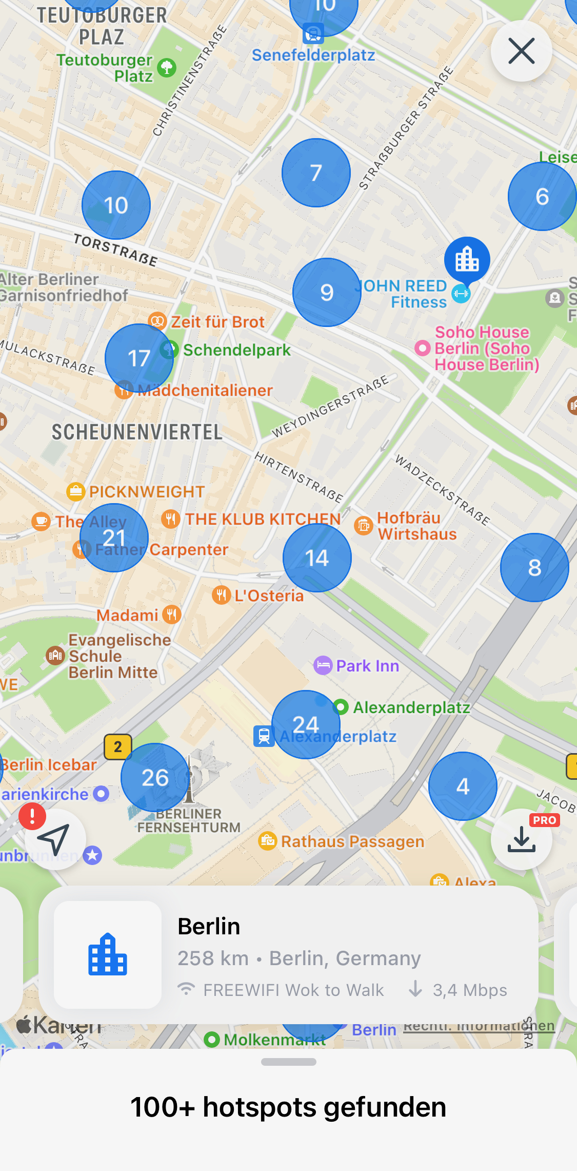 Sehr cool ist auch, dass du in der App einen Geschwindigkeitstest vom Hotspot durchführen kannst. Die App bietet auch Offline-Karten zum Laden an, um WLAN-Hotspots zu finden, ohne Mobilfunkdaten zu nutzen.