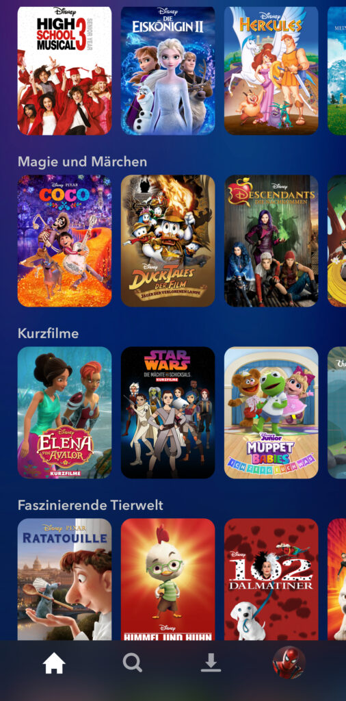 Aber auch Eltern finden bei Disney schöne Filme, Klassiker wie Star Wars, Marvelfilme und beeindruckende Dokumentationen von National Geographic. Filme und Serien können für unterwegs heruntergeladen werden.