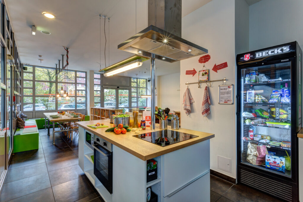 Im Erdgeschoss gibt es neben der Lobby einen Kitchenclub. Pizzaofen, Mikrowelle und Wasserkocher sowie das Geschirr können genutzt werden. Ideal für Familien, die ein cooles und günstiges Hotel in Hamburg mit Kindern suchen.