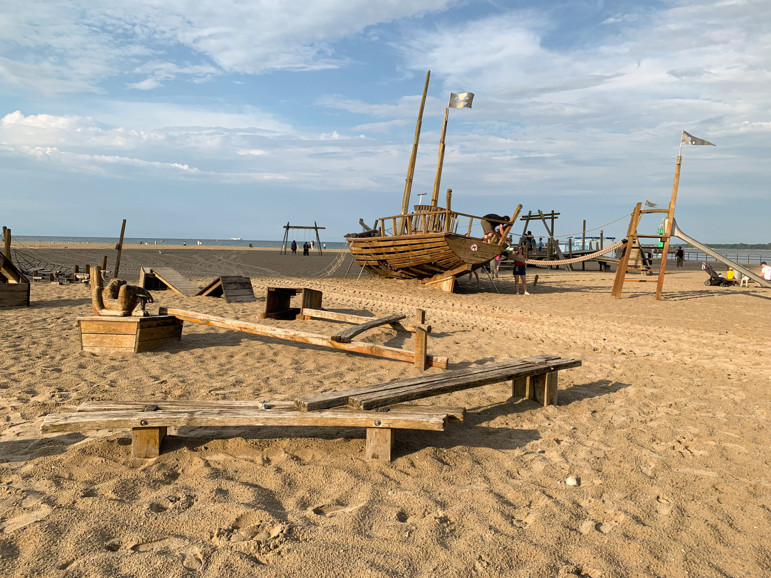 Der Spielplatz mitten am Strand ist sehr groß und hat für jedes Alter was zu bieten. Es gibt Schaukeln, eine Seilbahn, große Holztruhen und natürlich das riesige Piratenschiff, dass entdeckt werden möchte.