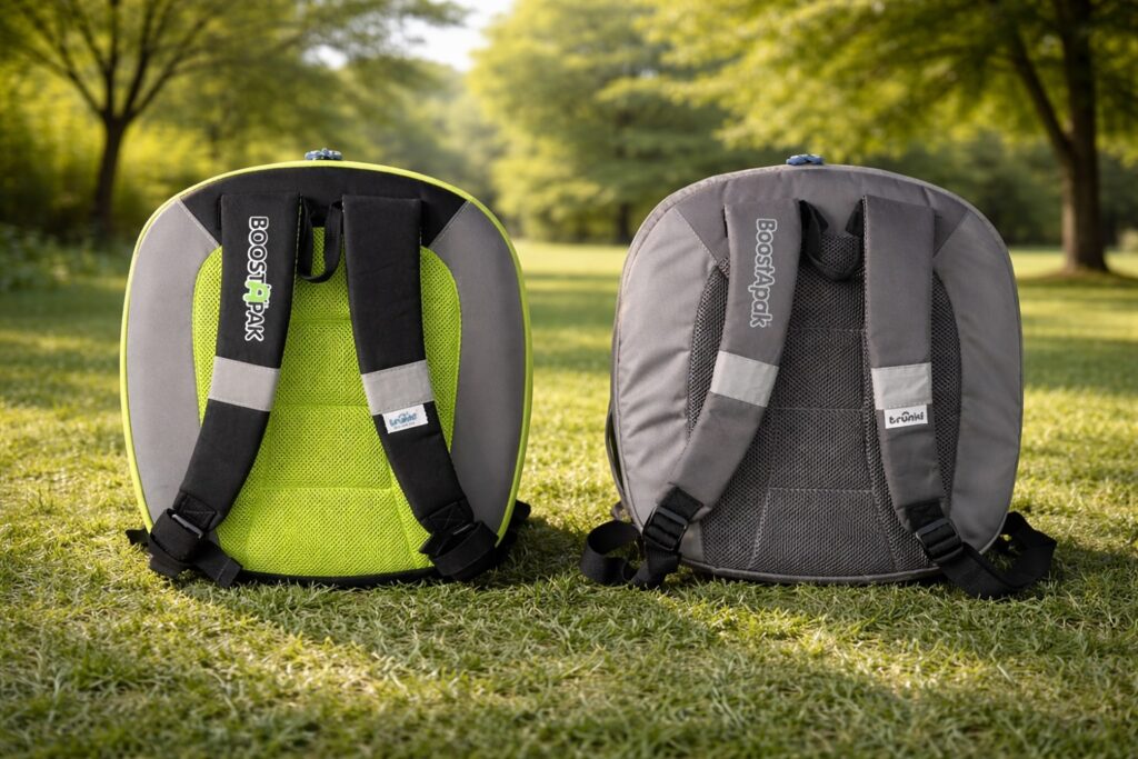 - Ideal für Reisen: Der BoostApak ist leicht (1,7 kg) und kompakt (40 x 36 x 16 cm), sodass Kinder ihn problemlos selbst tragen können.